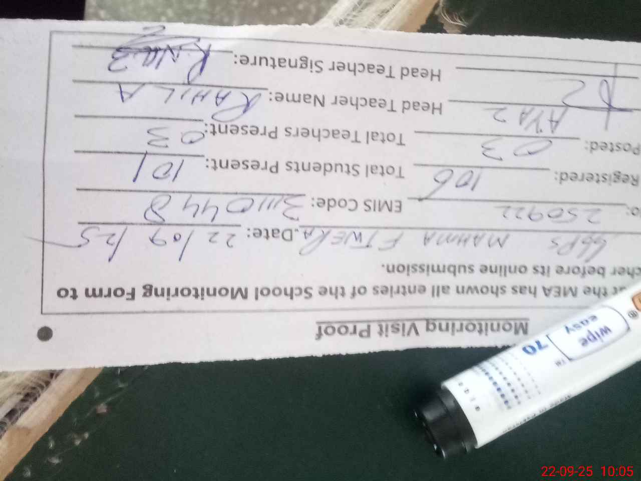 | Attendance Register | Head Teacher | MEA with School | Visit Proof |