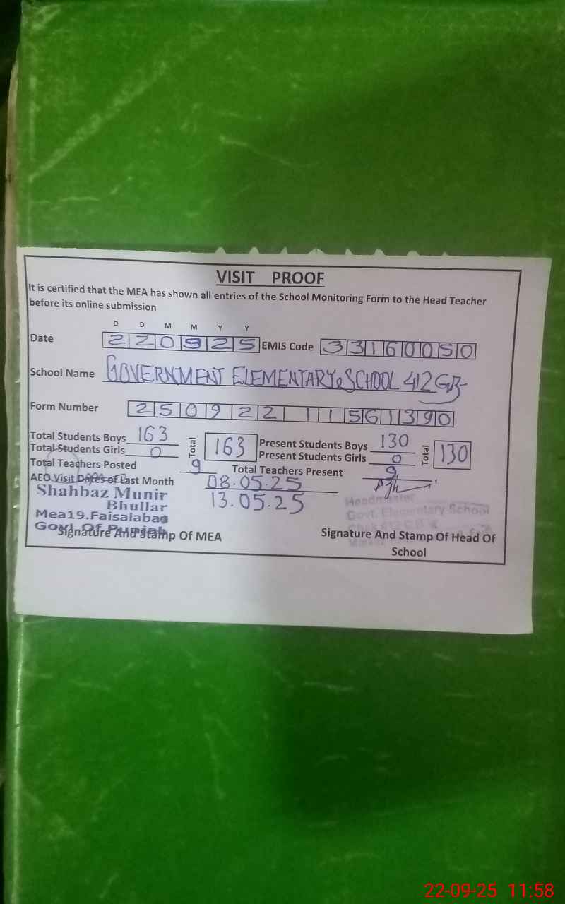 | EMIS Code: 33160050 | Name of School: GES CHAK 412 GB I TANDLIANWALA | |||