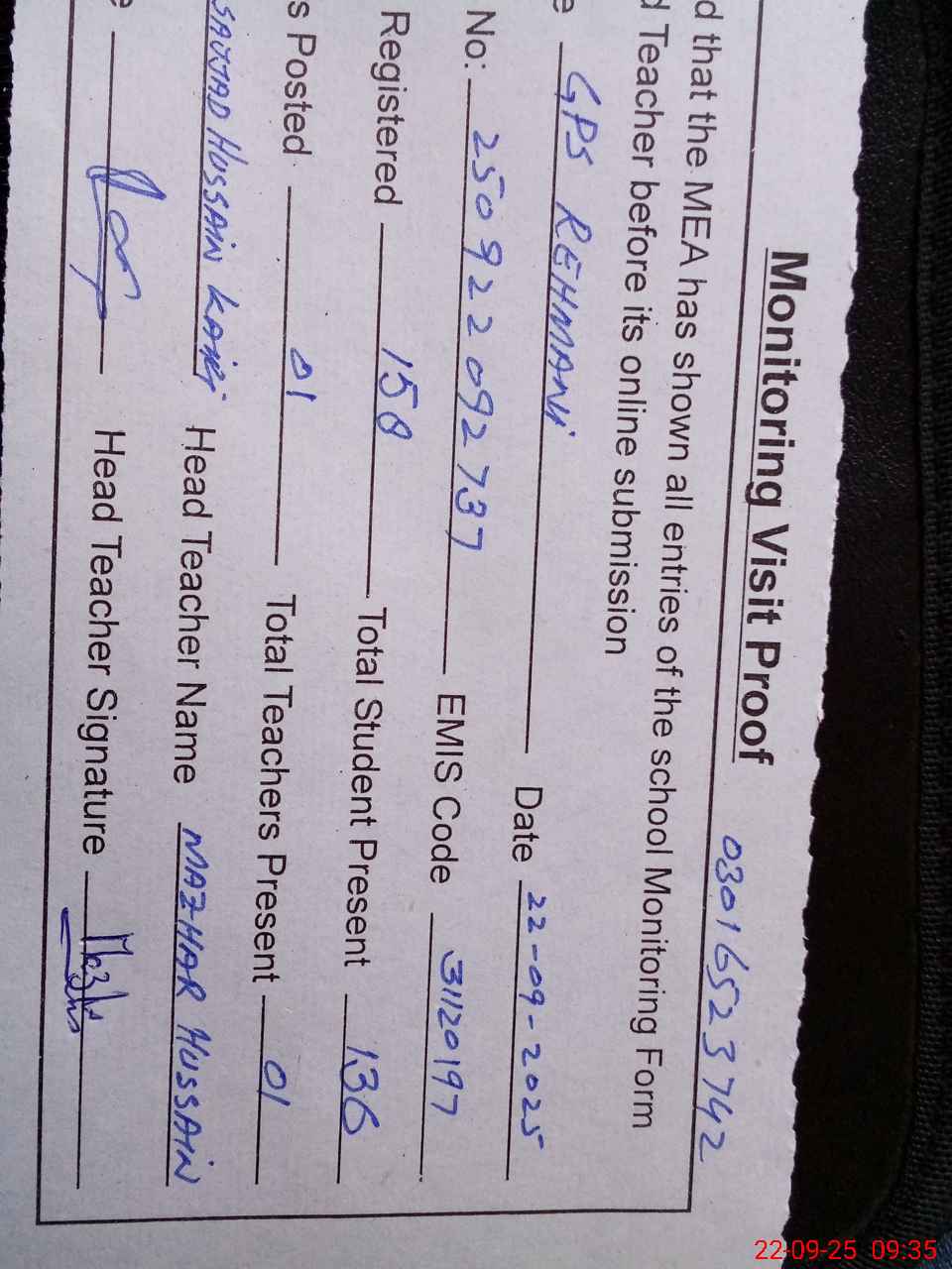 | EMIS Code: 31120197 | Name of School: GPS RAHMANNI | |||