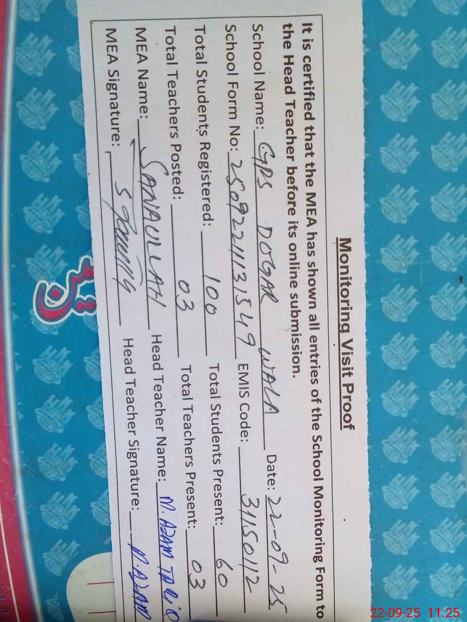 | Attendance Register | Head Teacher | MEA with School | Visit Proof |