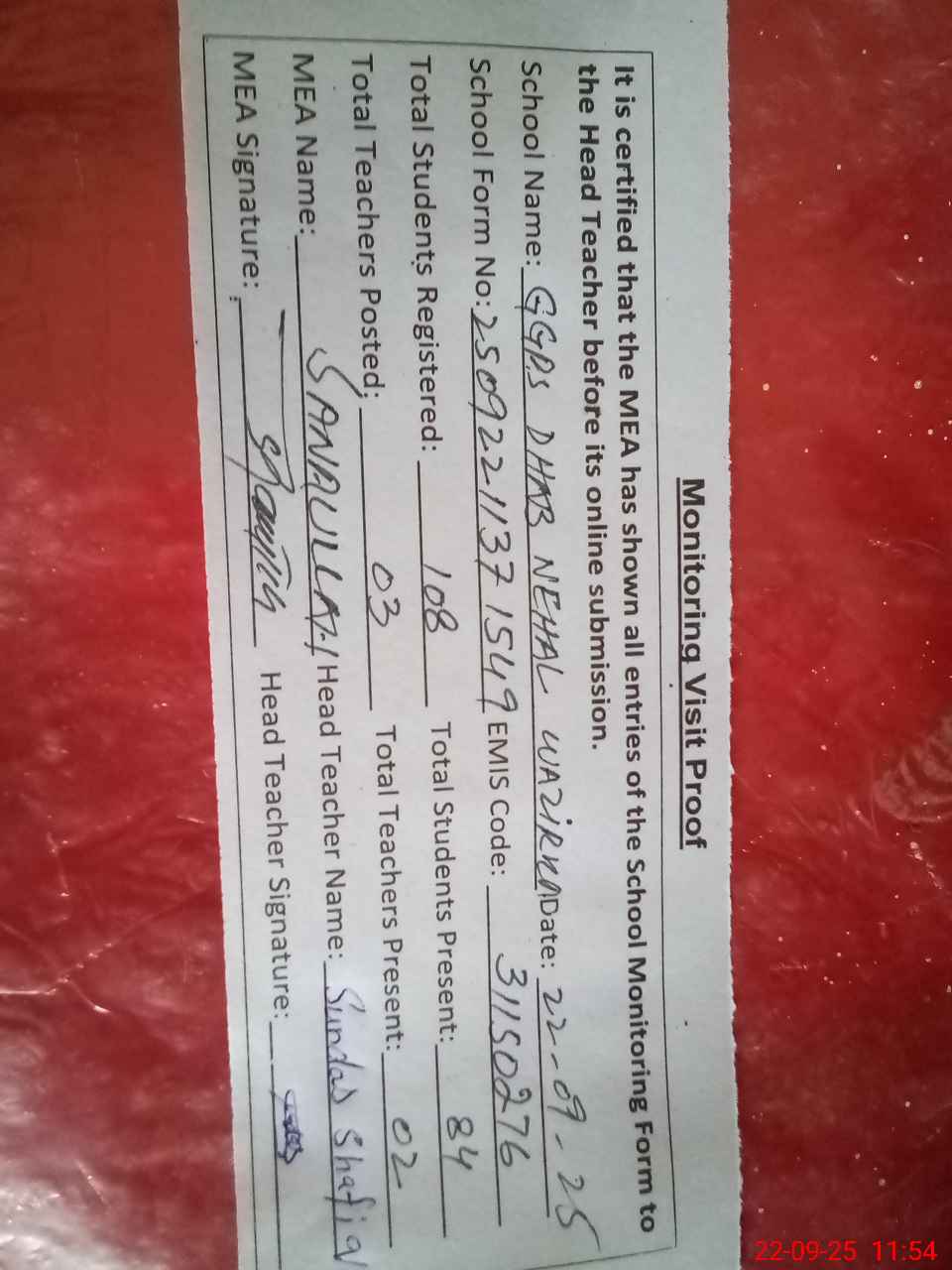 | Attendance Register | Head Teacher | MEA with School | Visit Proof |