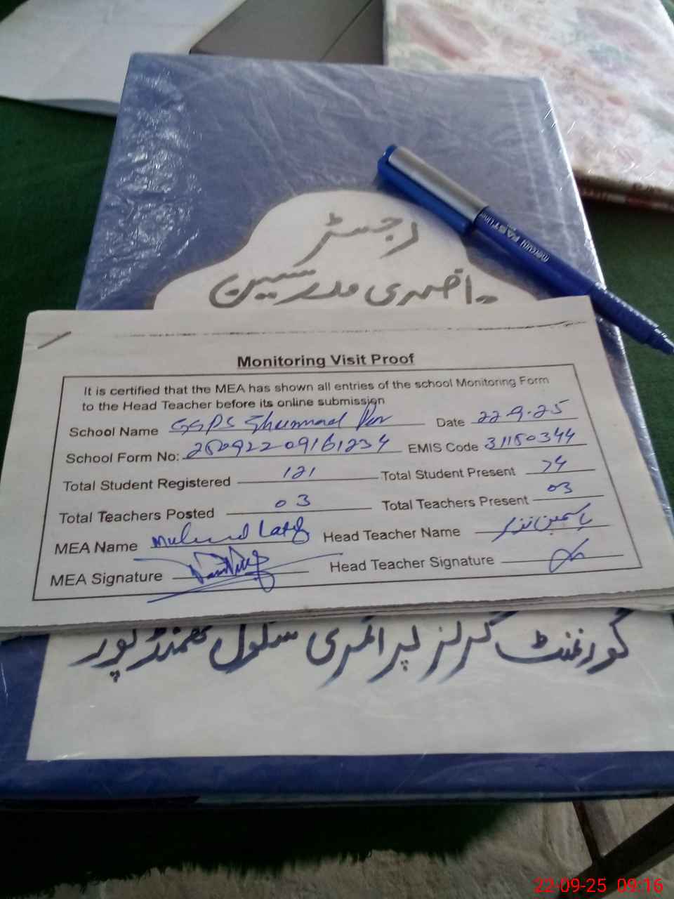 | Attendance Register | Head Teacher | MEA with School | Visit Proof |