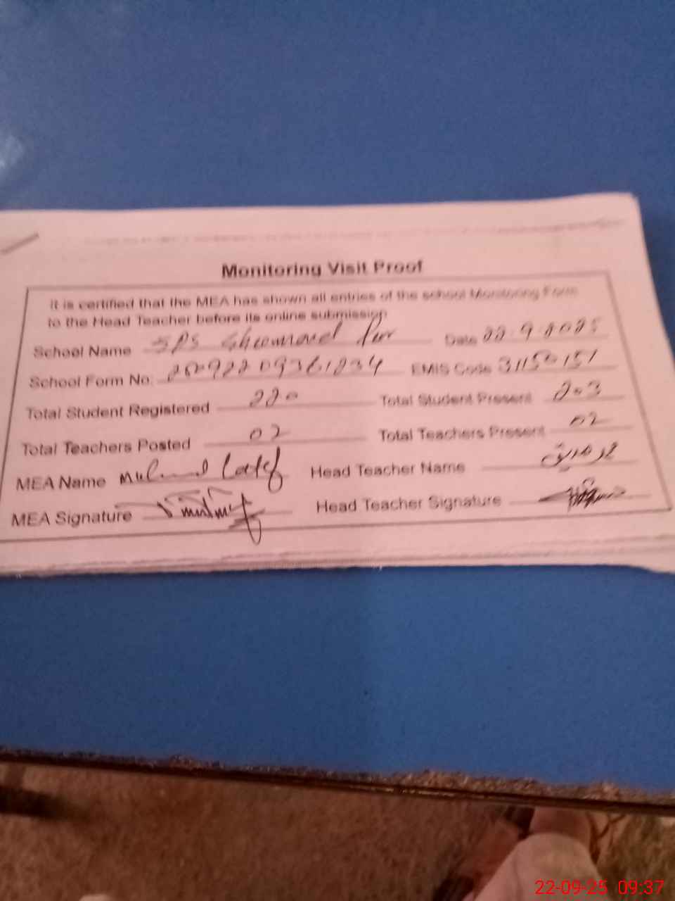 | Attendance Register | Head Teacher | MEA with School | Visit Proof |