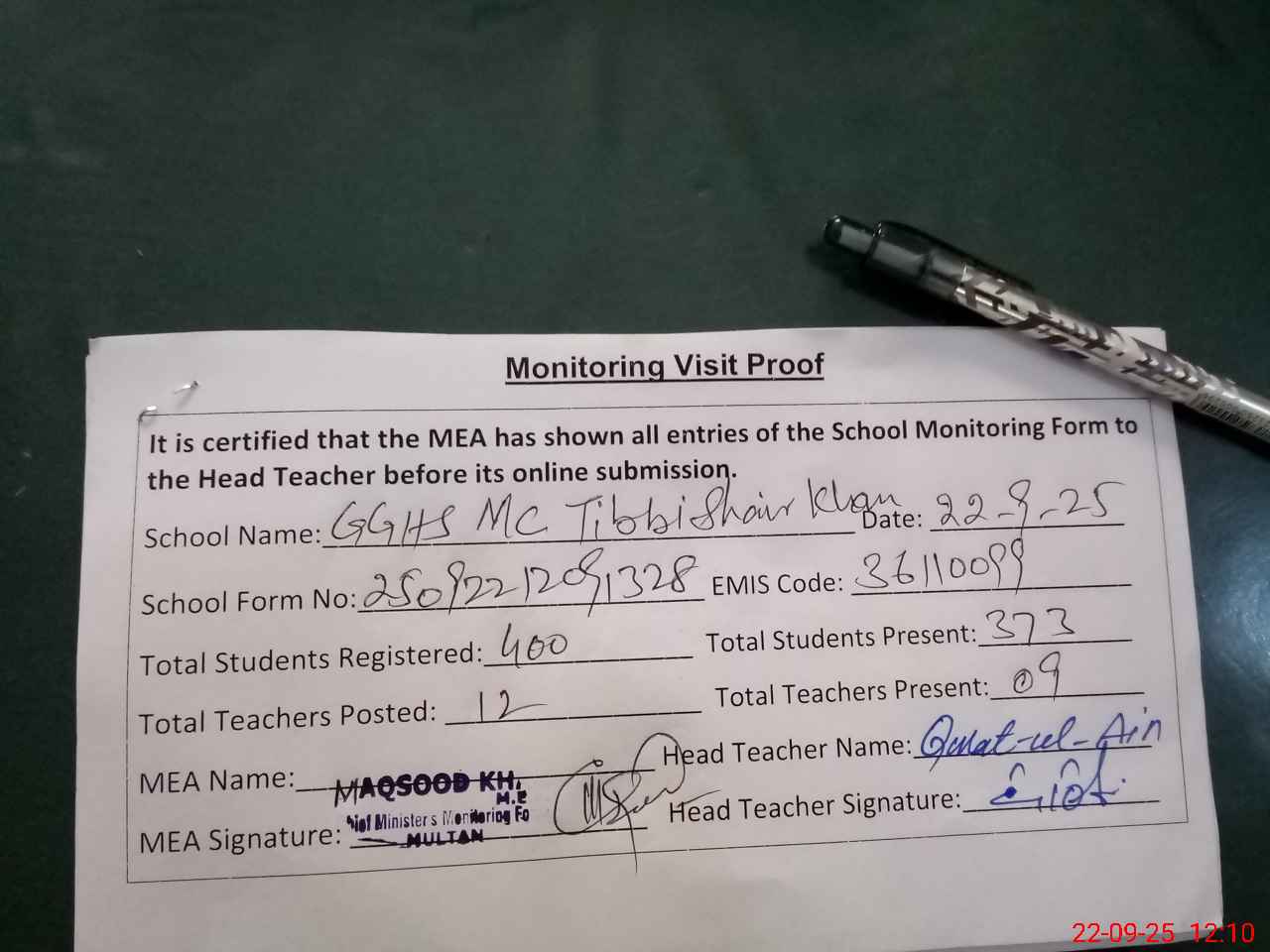 | Attendance Register | Head Teacher | MEA with School | Visit Proof |