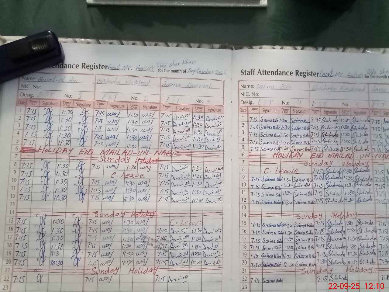| CNIC | Full Name | Designation | R/C | Absence During Last Calender Month |