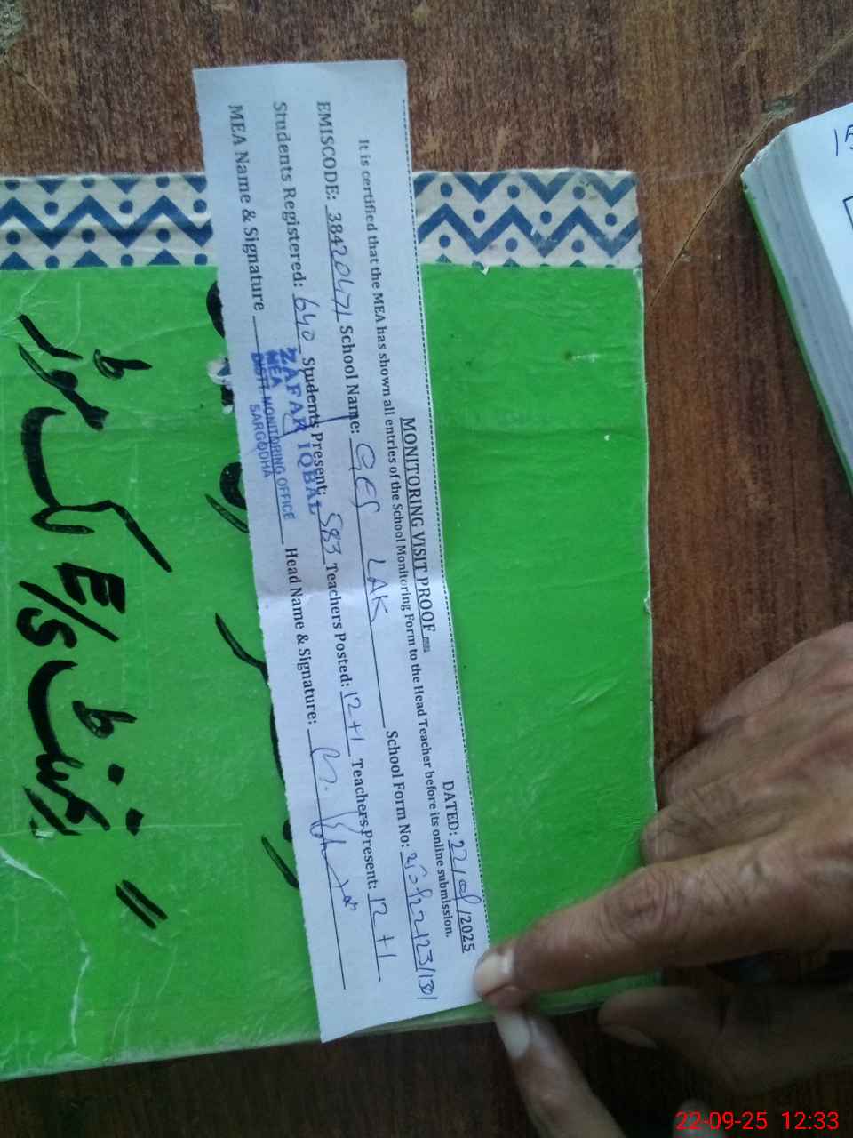 | Attendance Register | Head Teacher | MEA with School | Visit Proof |