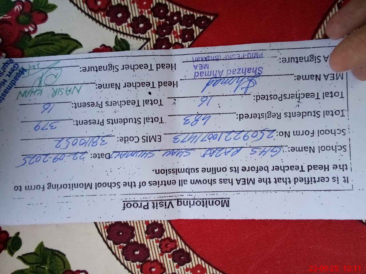 | EMIS Code: 38110052 | Name of School: GHS RAZAI SHAH SHUMALI | |||