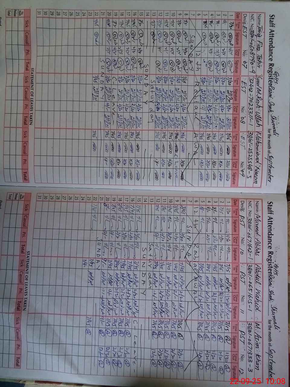 | CNIC | Full Name | Designation | R/C | Absence During Last Calender Month |