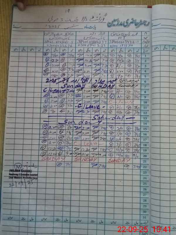 | Name: Mu**** Ha**** Kh**** Designation: (School Headmaster's/Headmistress's) PST Phone/Cell Number: 03**** |