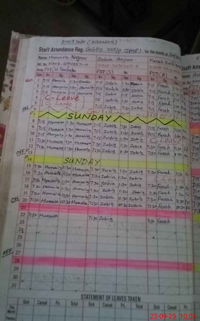| CNIC | Full Name | Designation | R/C | Absence During Last Calender Month |