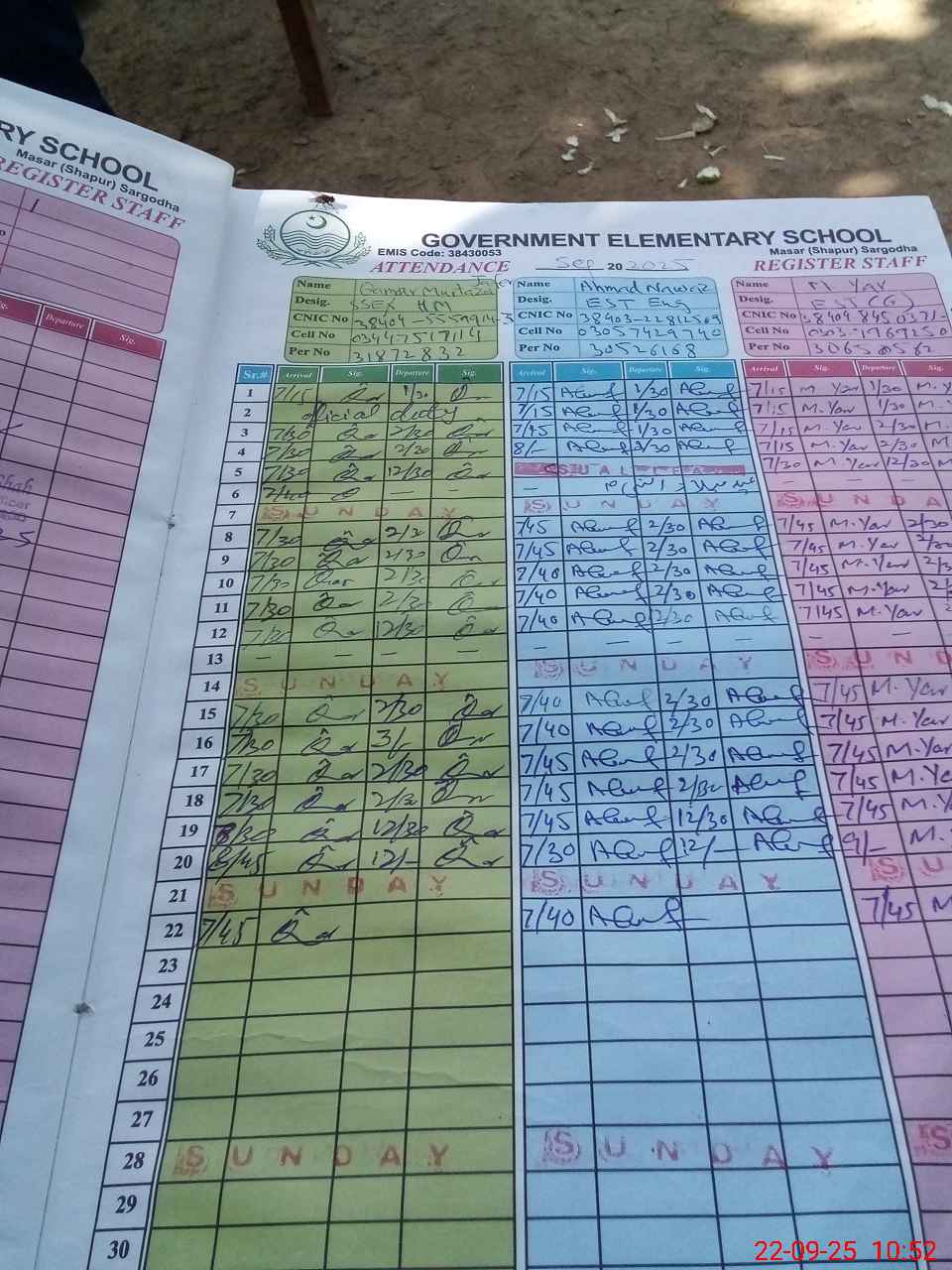 | CNIC | Full Name | Designation | R/C | Absence during last cal. month |