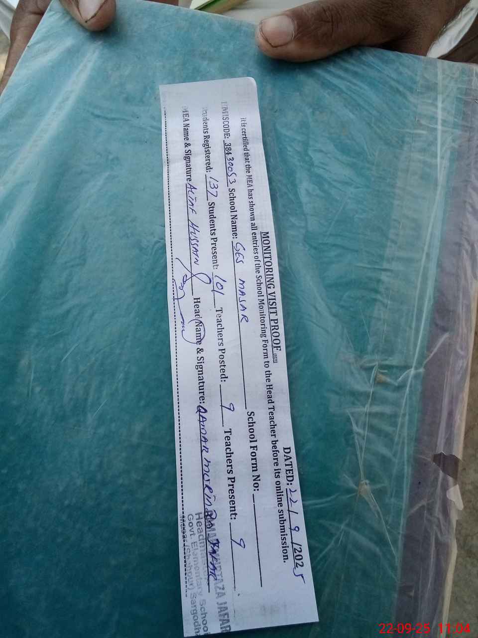 | Attendance Register | Head Teacher | MEA with School | Visit Proof |