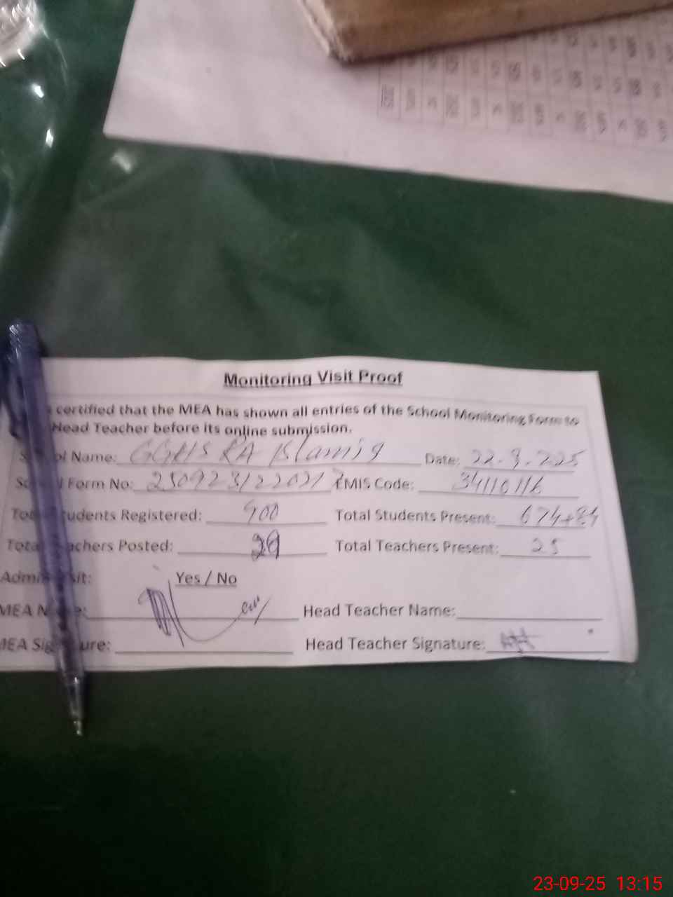| Attendance Register | Head Teacher | MEA with School | Visit Proof |