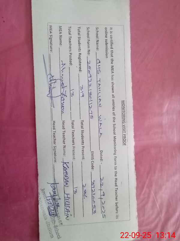 | EMIS Code: 37210053 | Name of School: GHS TAHLIAN WALA | |||