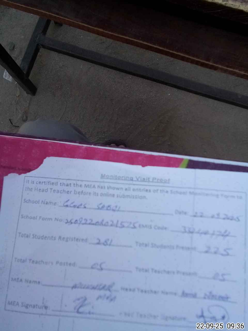 | Attendance Register | Head Teacher | MEA with School | Visit Proof |