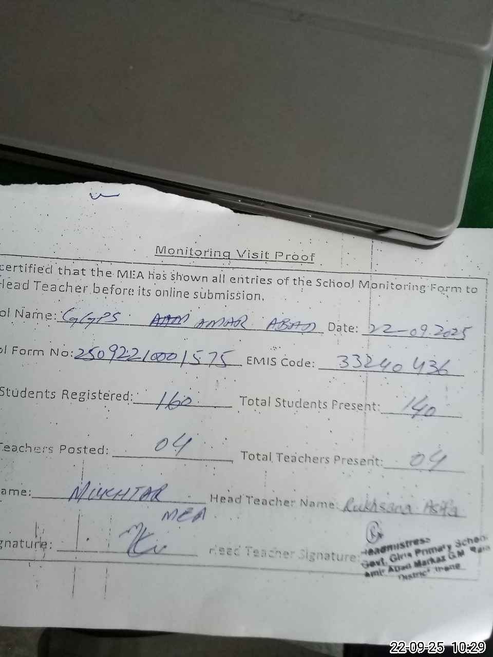 | Attendance Register | Head Teacher | MEA with School | Visit Proof |