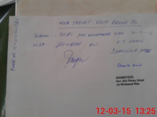 | School Visited by School Health & Nutrition Supervisor (No. of Visits) | 1 | Name1: | Nisar Ahmed | Name2: | |