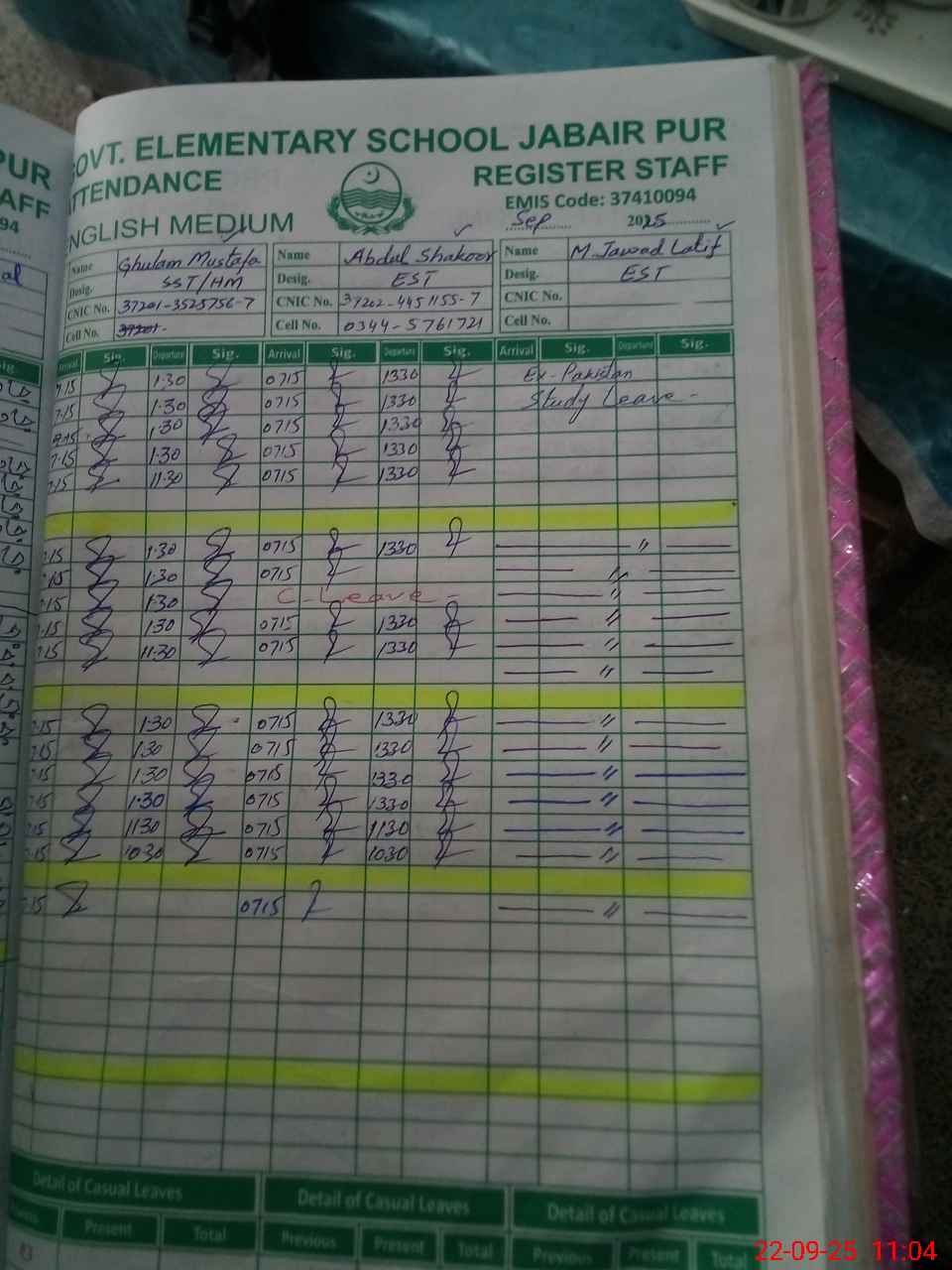 | CNIC | Full Name | Designation | R/C | Absence during last cal. month |