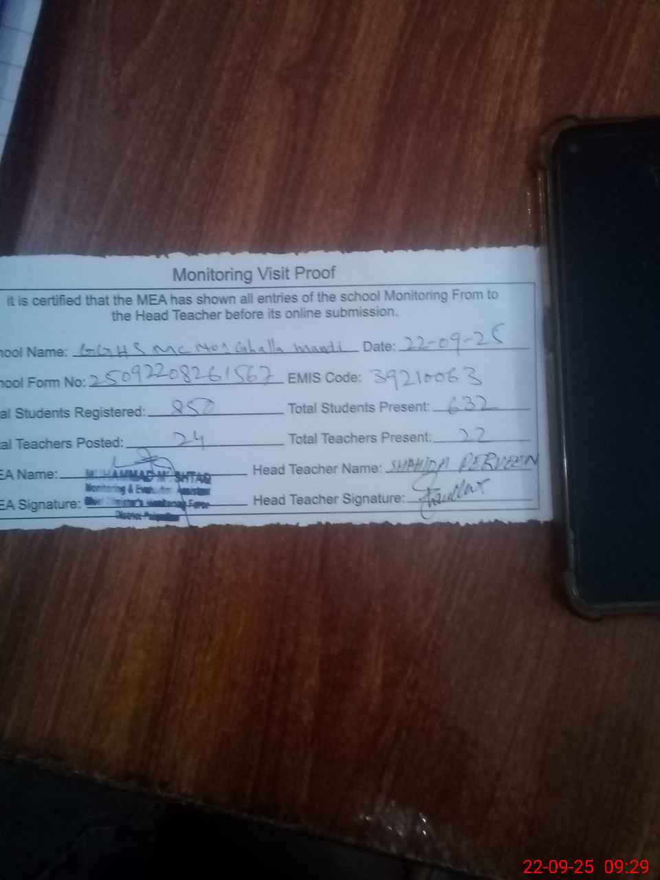 | Attendance Register | Head Teacher | MEA with School | Visit Proof |
