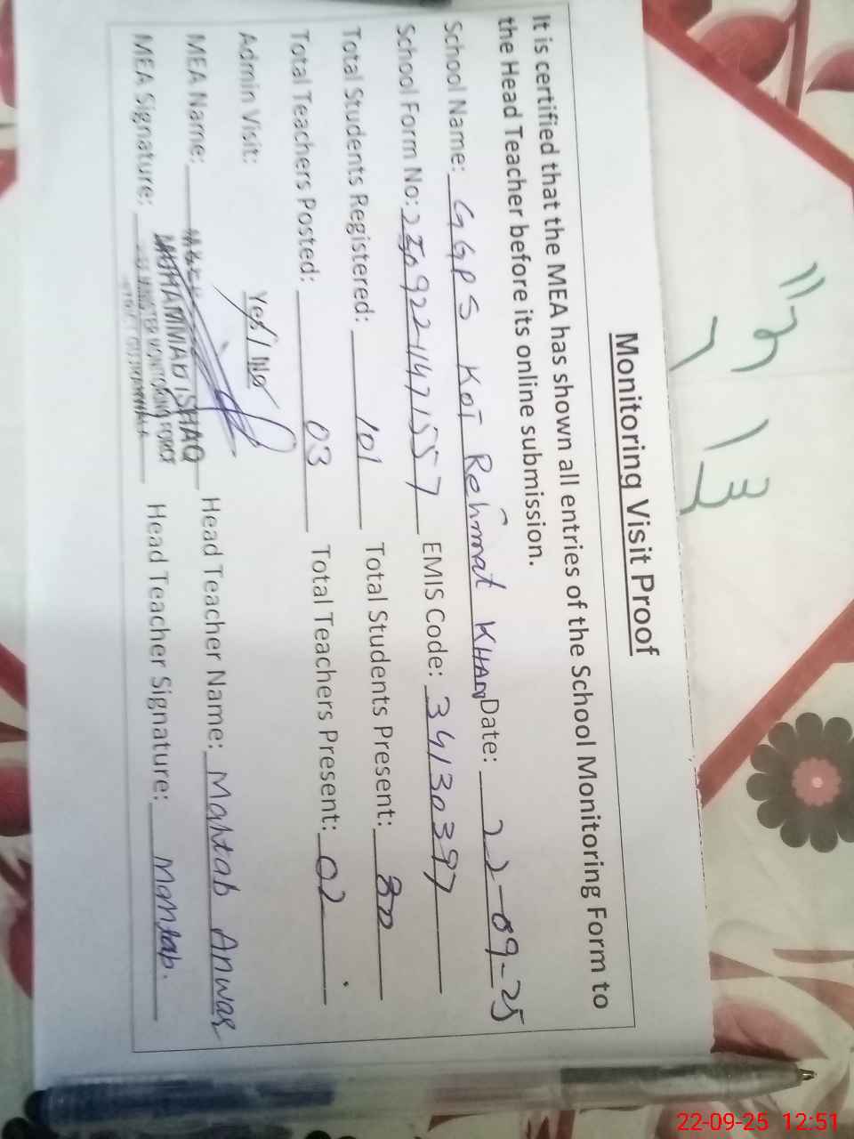 | Attendance Register | Head Teacher | MEA with School | Visit Proof |