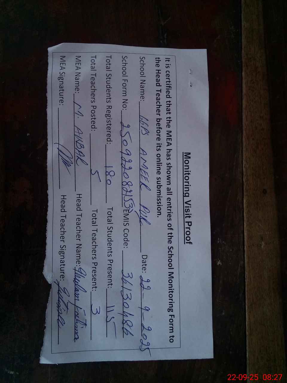 | Attendance Register | Head Teacher | MEA with School | Visit Proof |