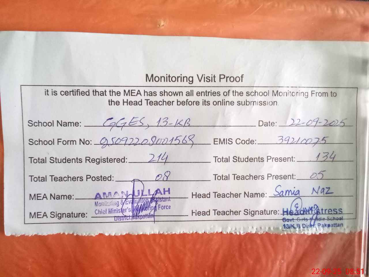 | Attendance Register | Head Teacher | MEA with School | Visit Proof |