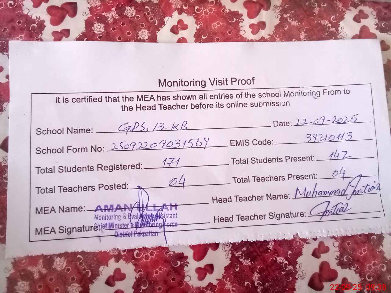 | Attendance Register | Head Teacher | MEA with School | Visit Proof |