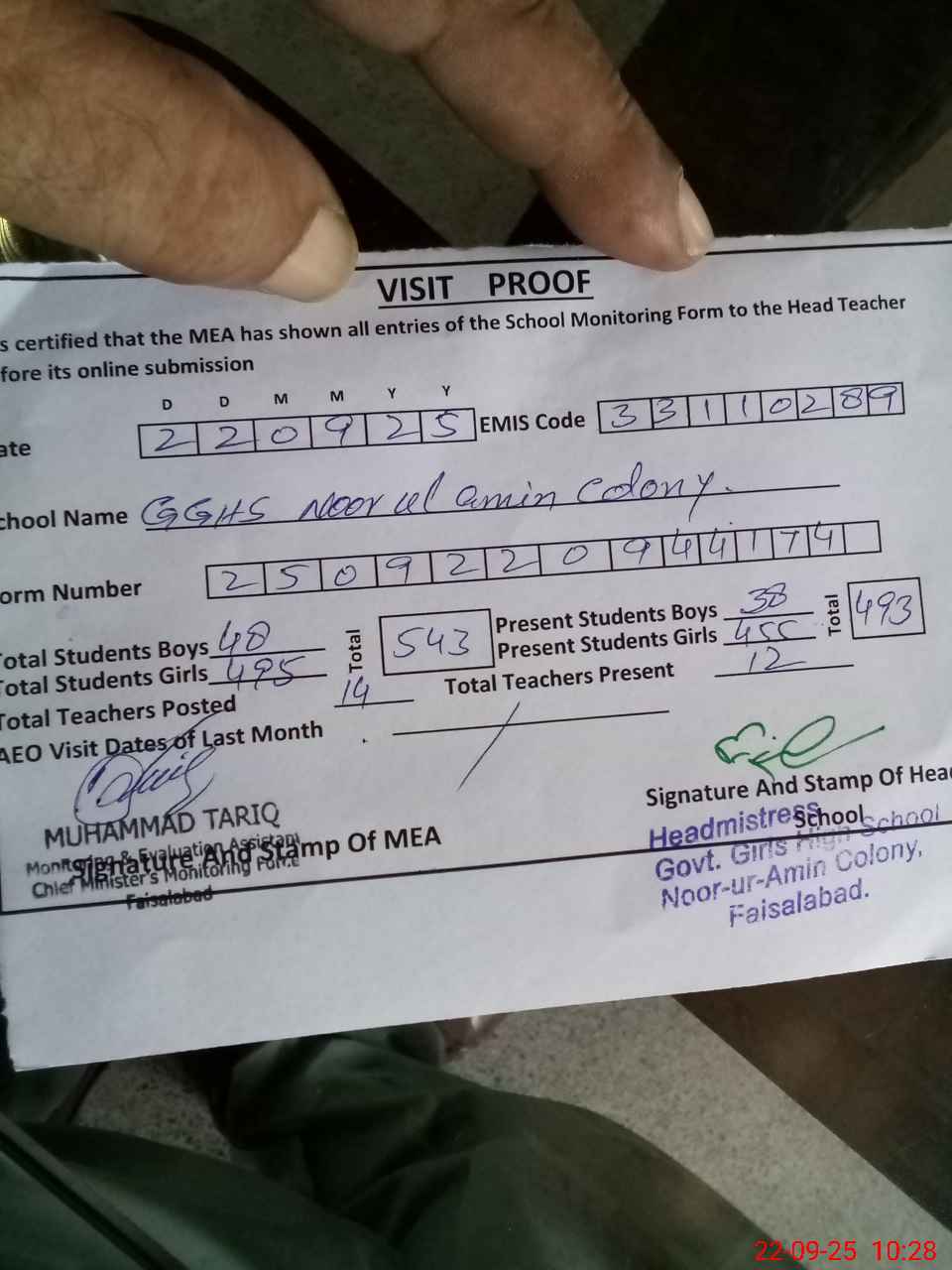 | EMIS Code: 33110289 | Name of School: GGHS NOOR UL AMIN COLONY FSD | |||