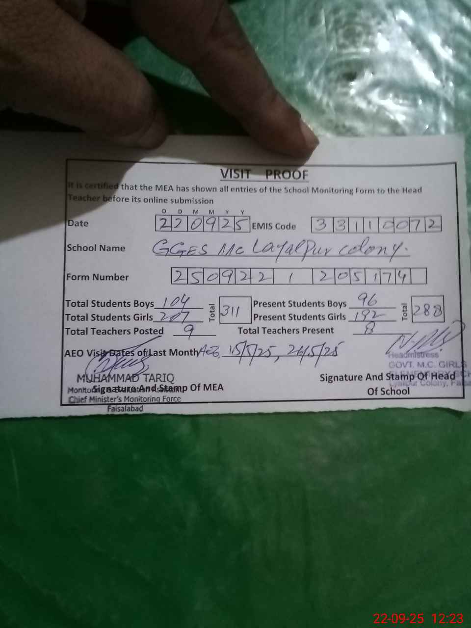 | Attendance Register | Head Teacher | MEA with School | Visit Proof |