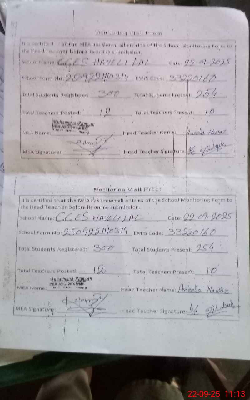 | EMIS Code: 33220160 | Name of School: GGES HAVELI LAL | |||
