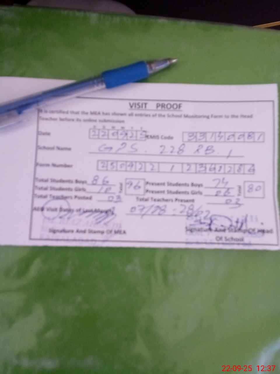| EMIS Code: 33140081 | Name of School: GPS CHAK 228 RB I | |||
