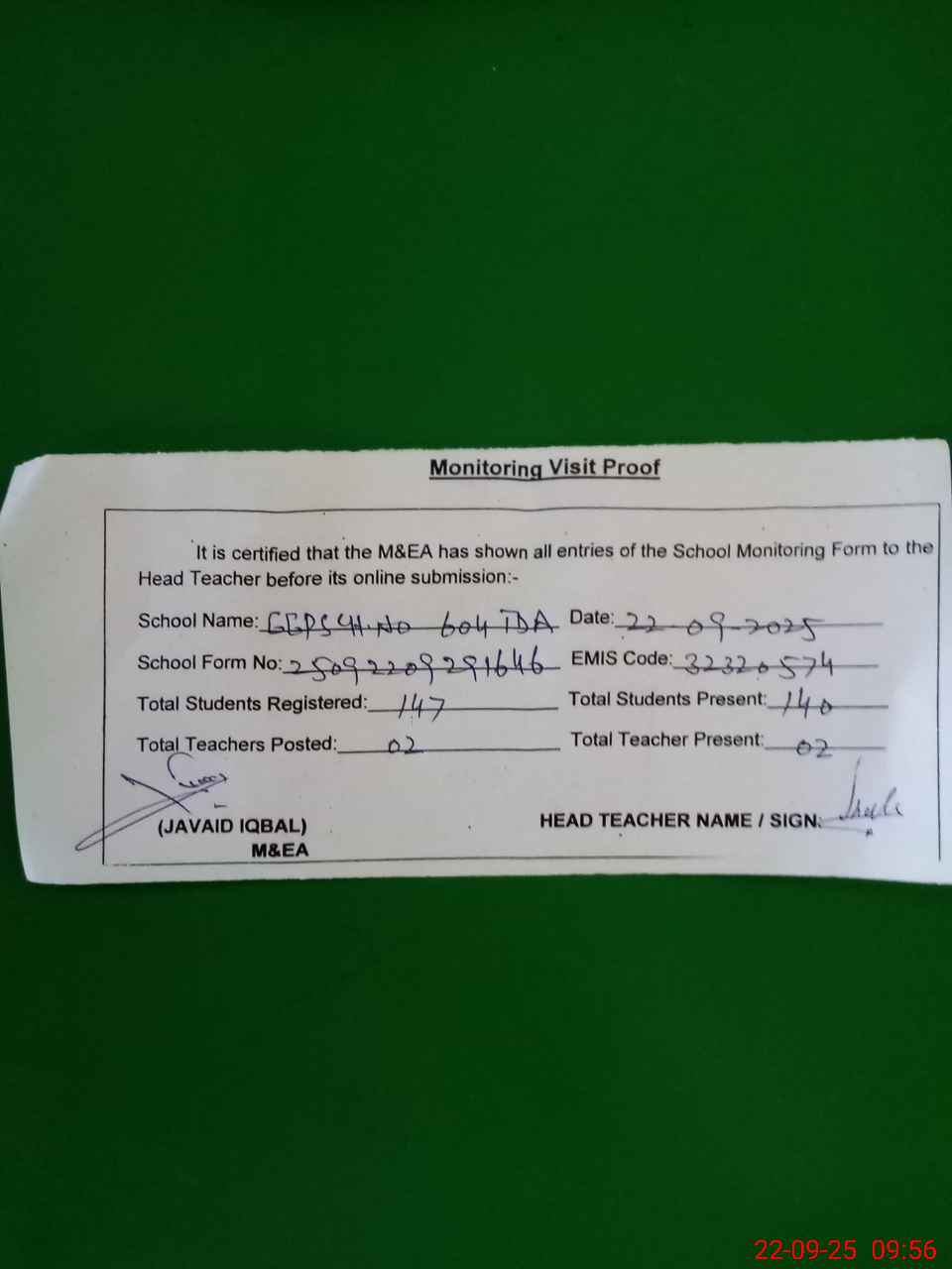 | Attendance Register | Head Teacher | MEA with School | Visit Proof |