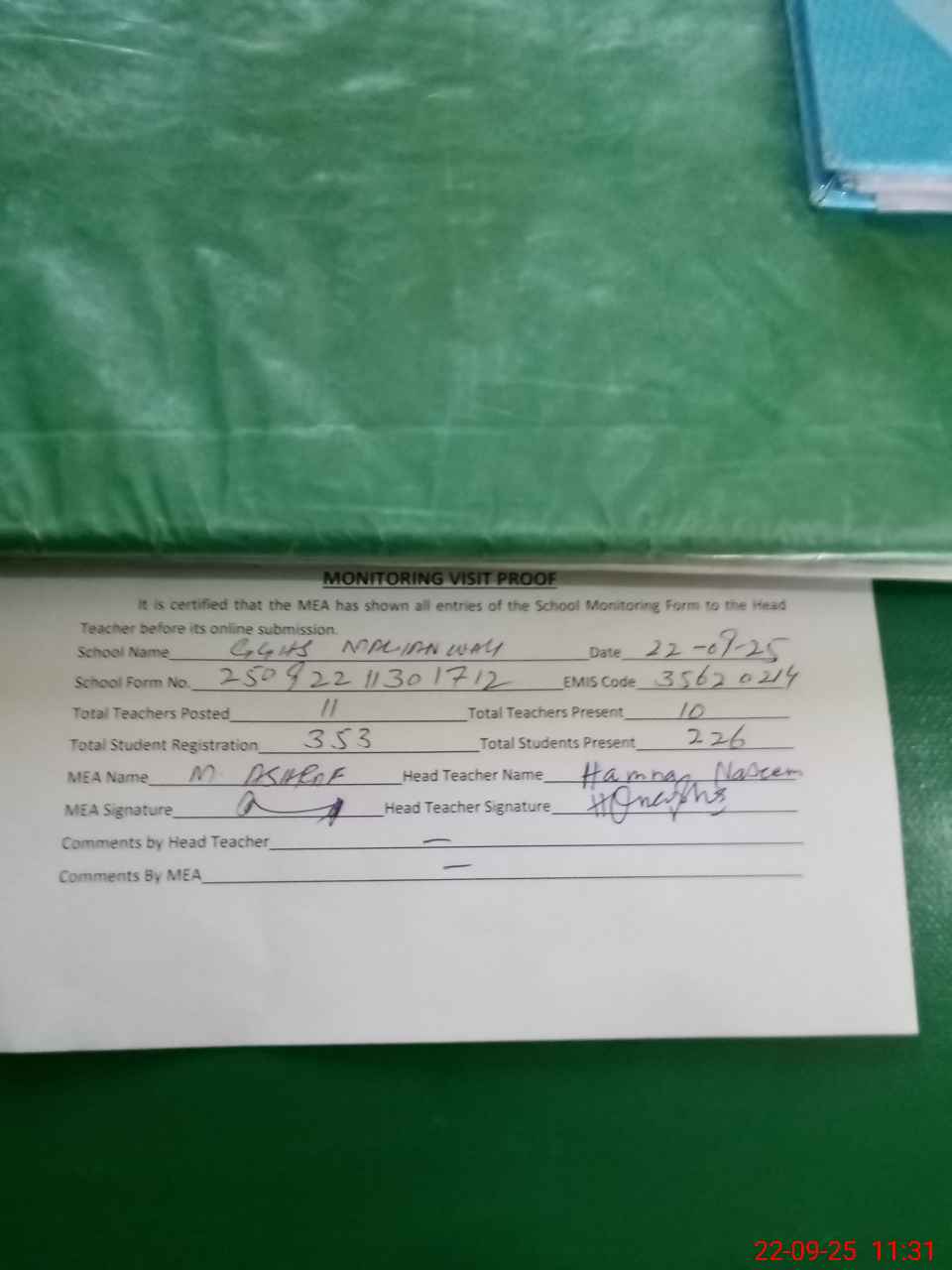 | Attendance Register | Head Teacher | MEA with School | Visit Proof |
