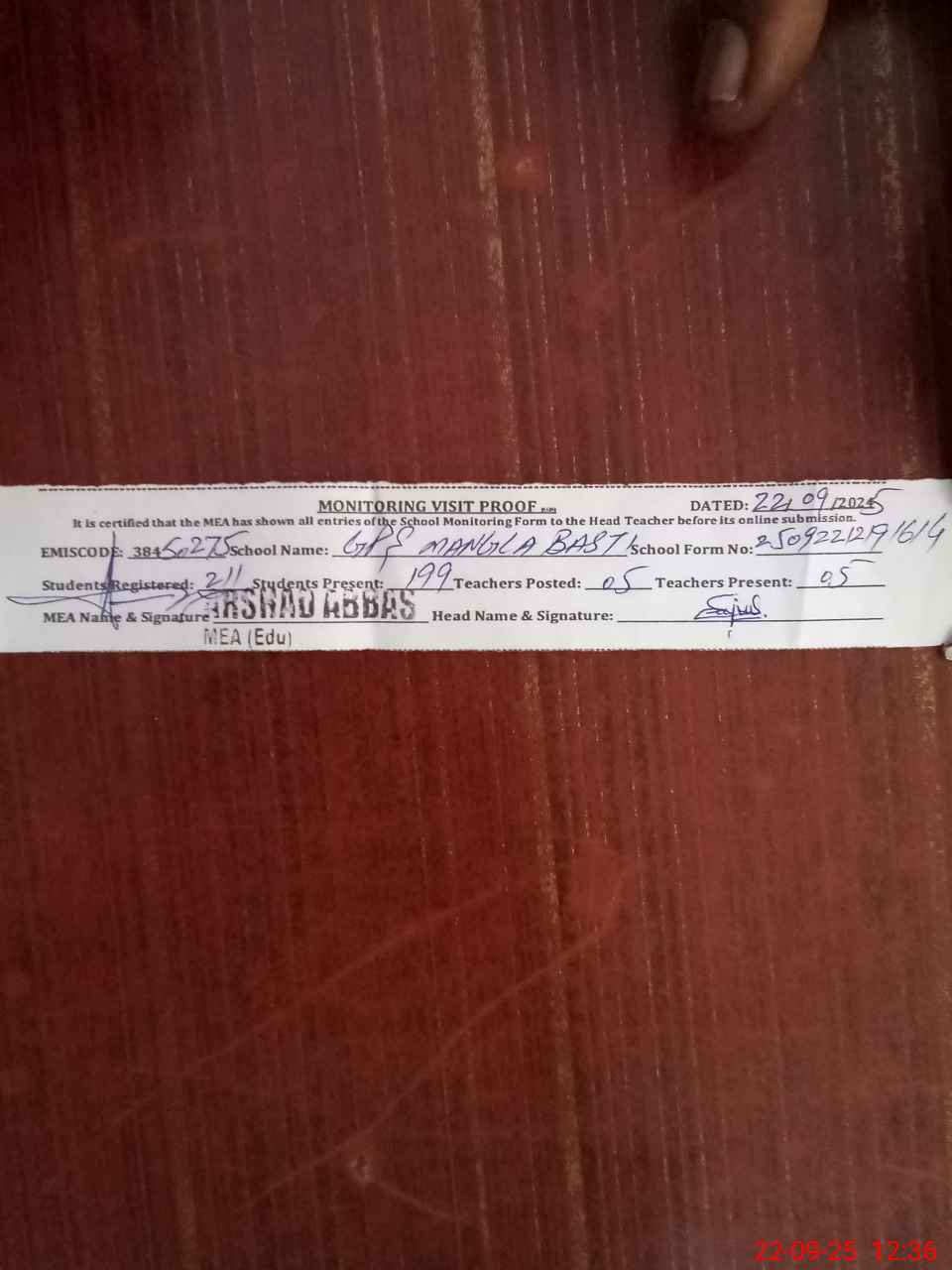 | Attendance Register | Head Teacher | MEA with School | Visit Proof |