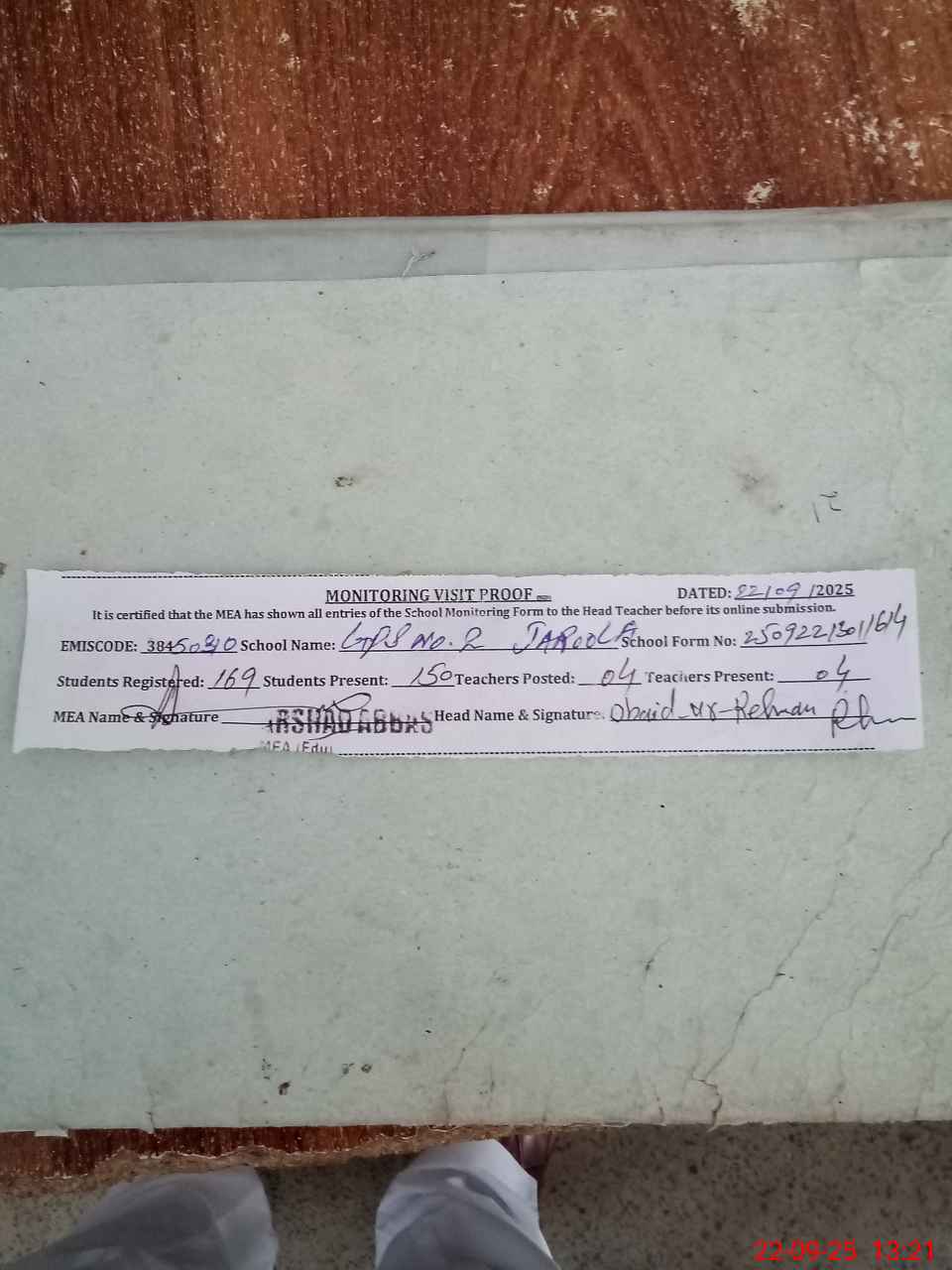 | Attendance Register | Head Teacher | MEA with School | Visit Proof |