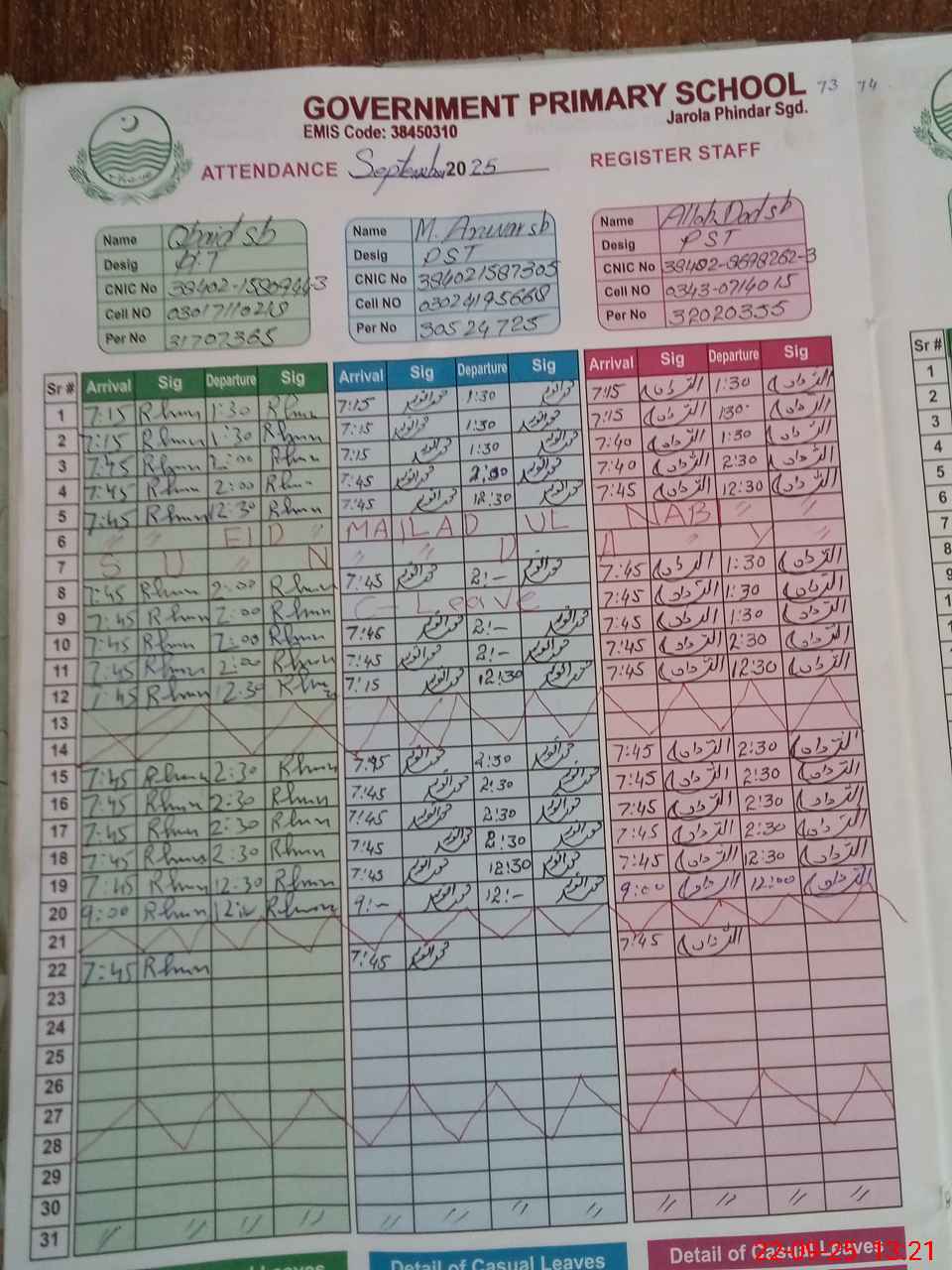 | CNIC | Full Name | Designation | R/C | Absence during last cal. month |