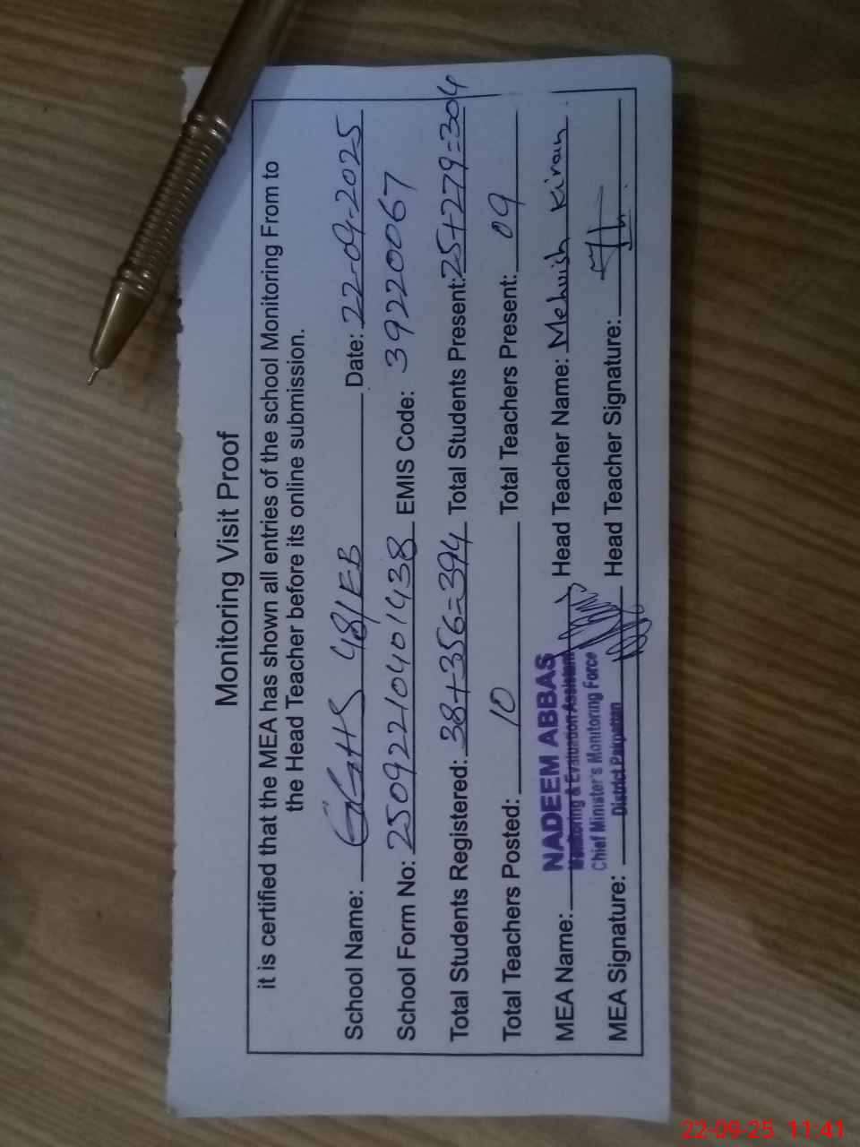| Attendance Register | Head Teacher | MEA with School | Visit Proof |
