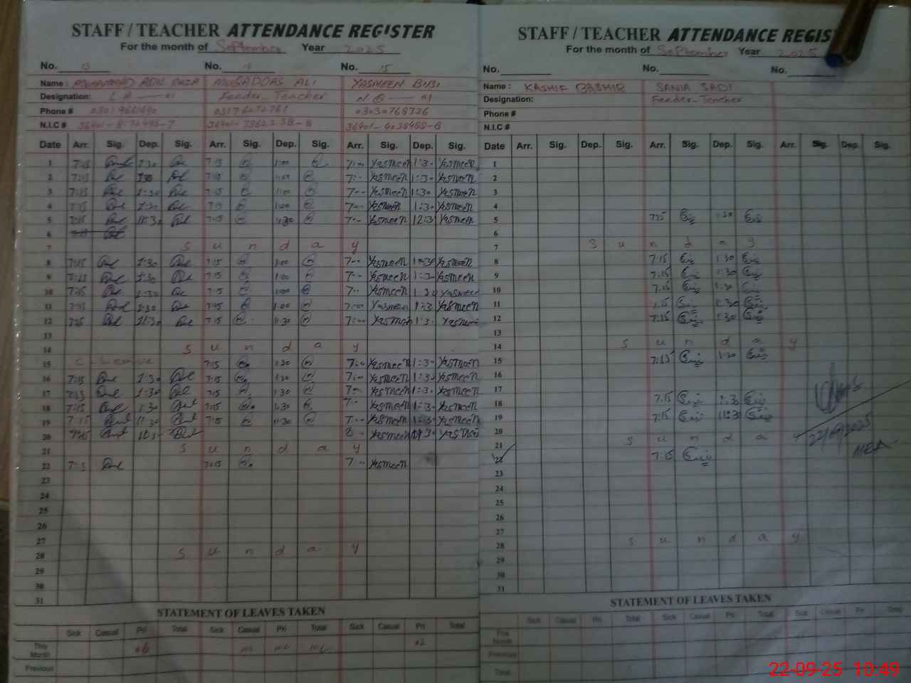| CNIC | Full Name | Designation | R/C | Absence During Last Calender Month |