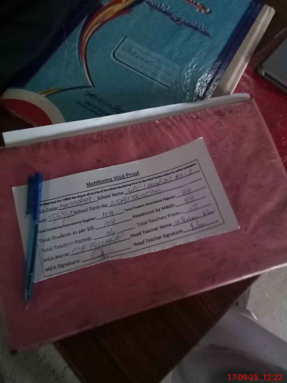 | Attendance Register | Head Teacher | MEA with School | Visit Proof |