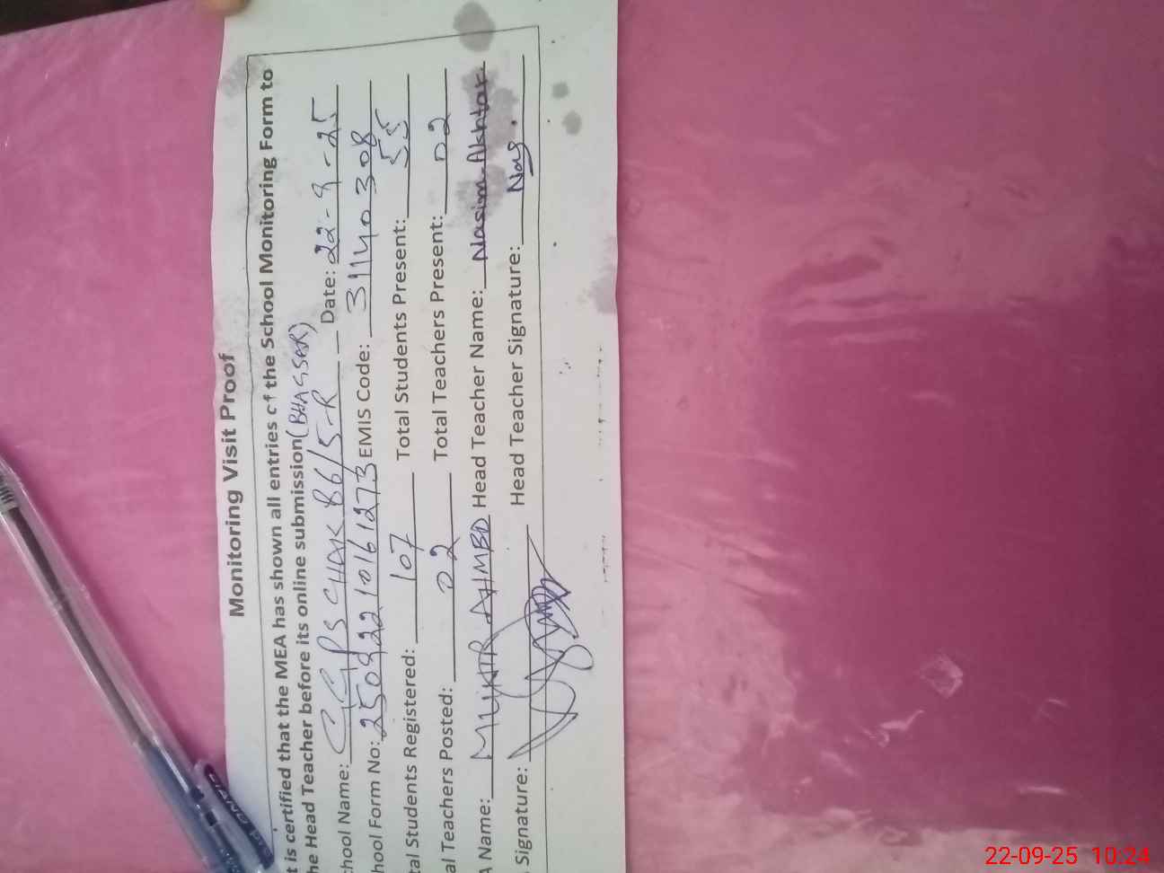 | Attendance Register | Head Teacher | MEA with School | Visit Proof |