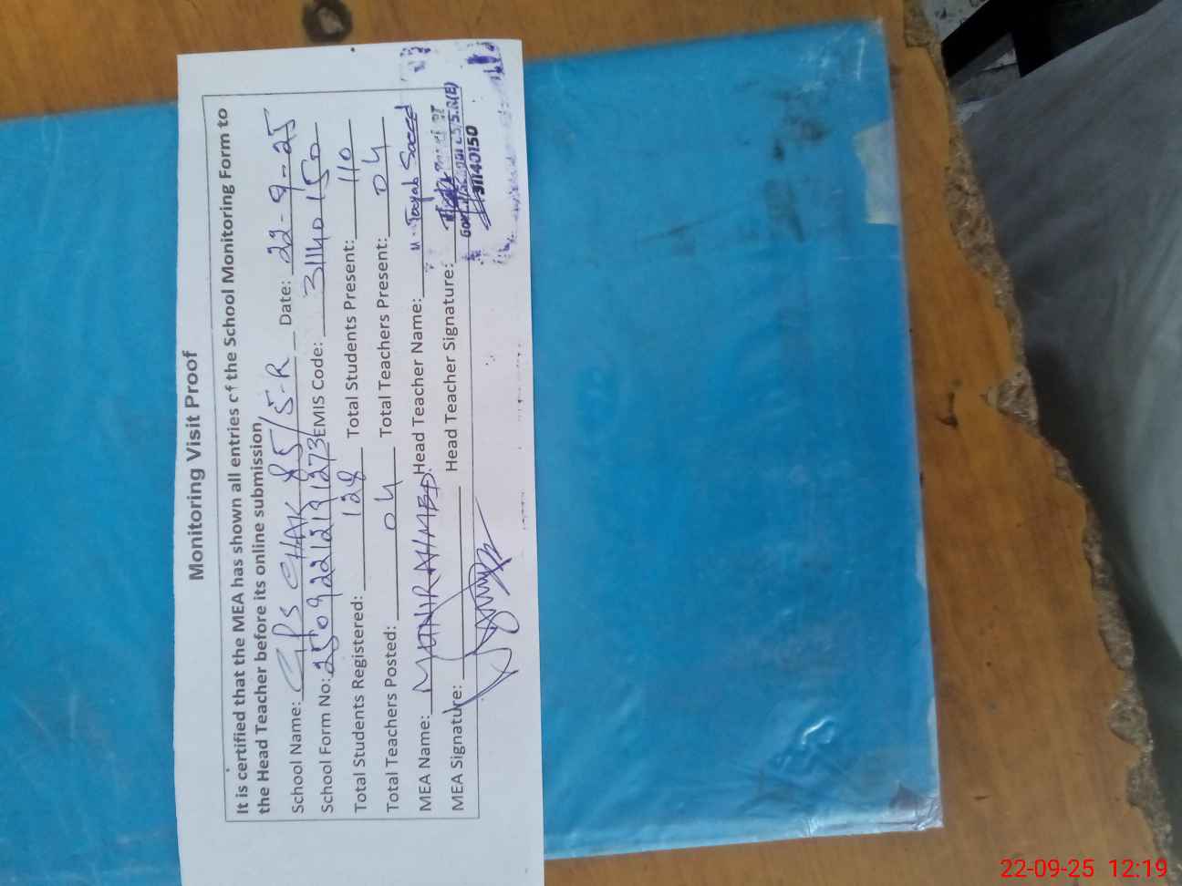 | Attendance Register | Head Teacher | MEA with School | Visit Proof |
