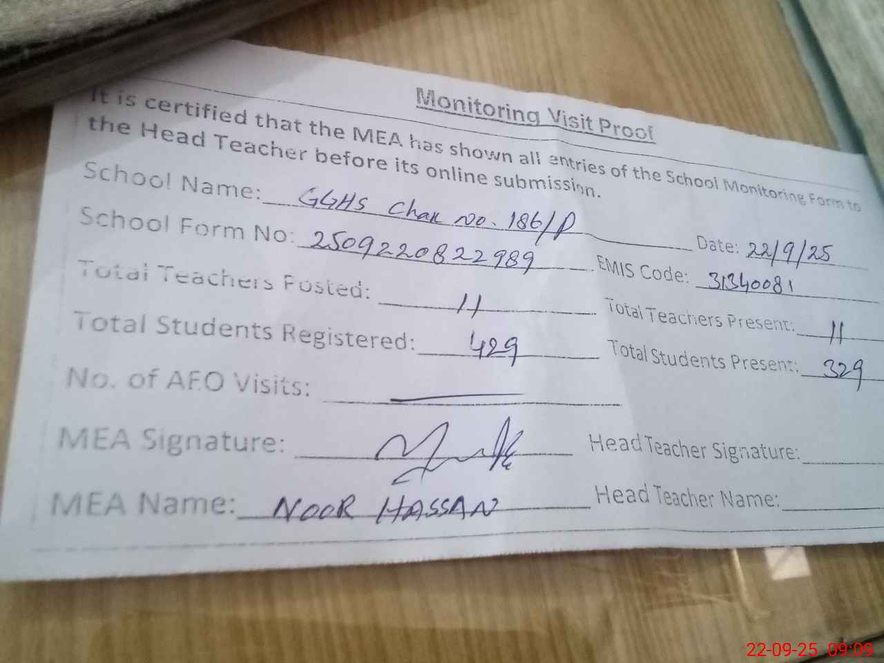 | Attendance Register | Head Teacher | MEA with School | Visit Proof |
