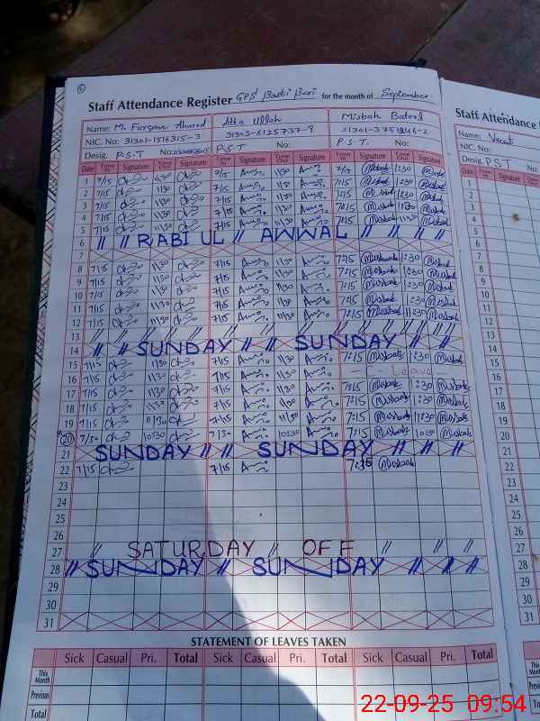| CNIC | Full Name | Designation | R/C | Absence During Last Calender Month |