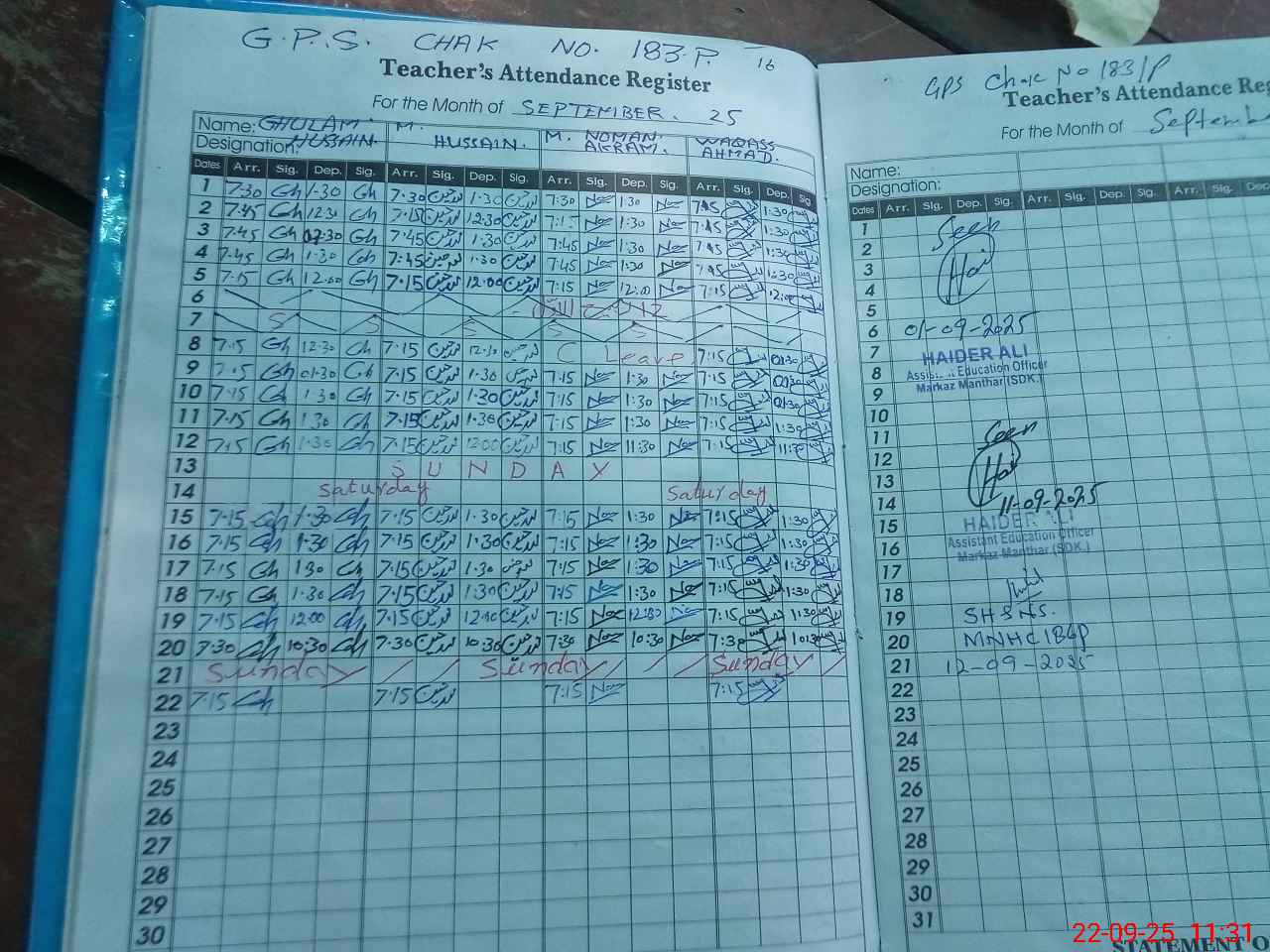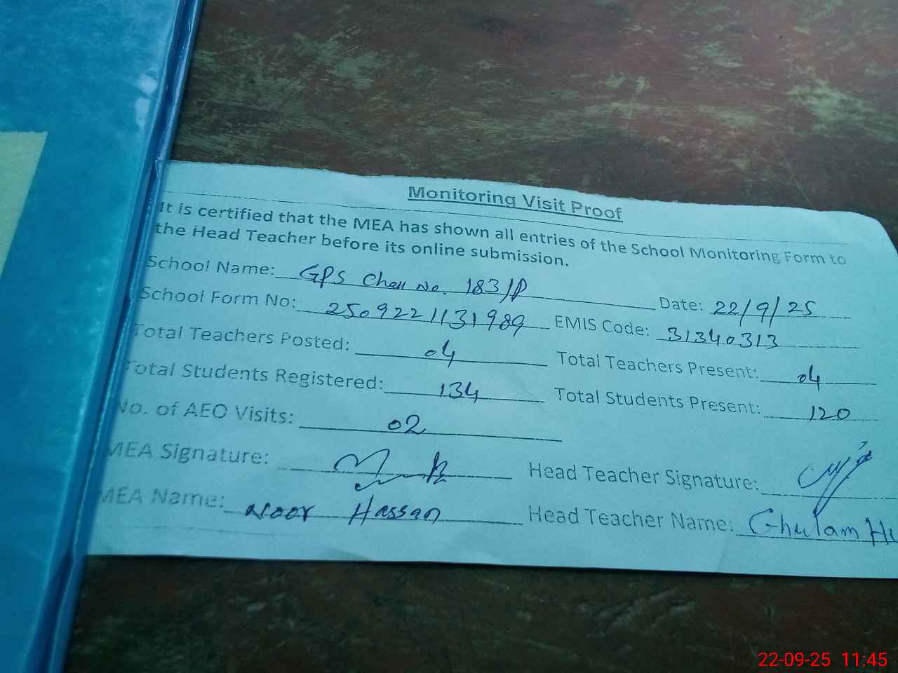 | Attendance Register | Head Teacher | MEA with School | Visit Proof |