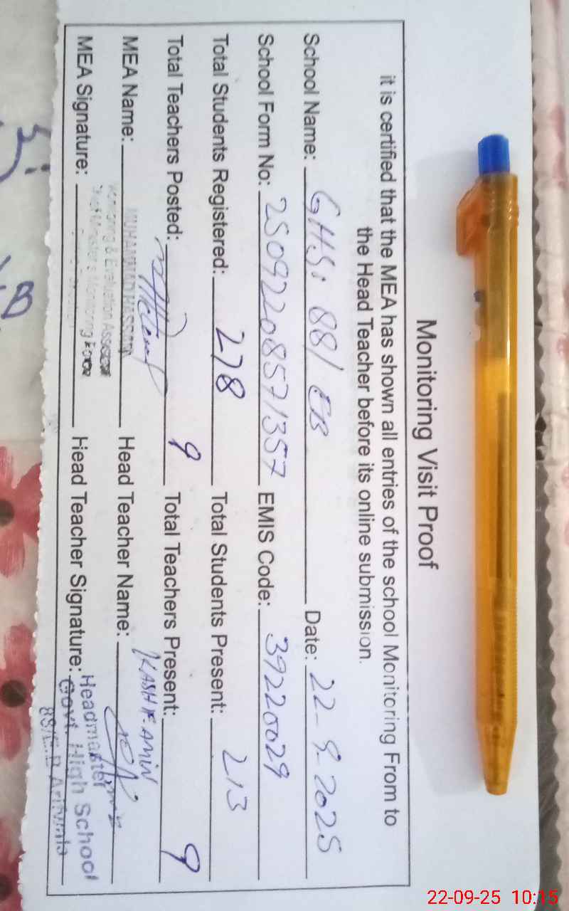 | EMIS Code: 39220029 | Name of School: GHS 88/E-B ARIFWALA | |||