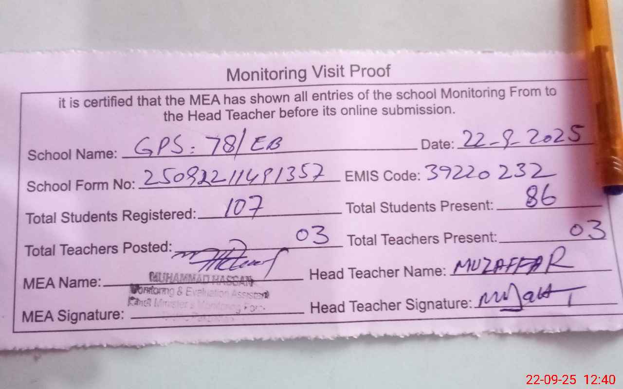 | EMIS Code: 39220232 | Name of School: GPS 78 EB ARIF WALA | |||