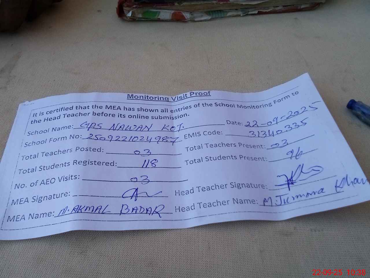 | Attendance Register | Head Teacher | MEA with School | Visit Proof |