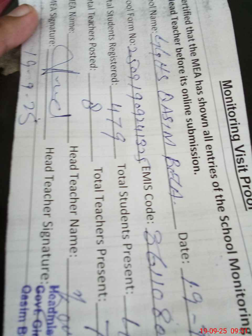 | Certified that this School was Inspected by the Undersigned MEA/DMO Today and the Information Stated Above is as Per Record. | |||||