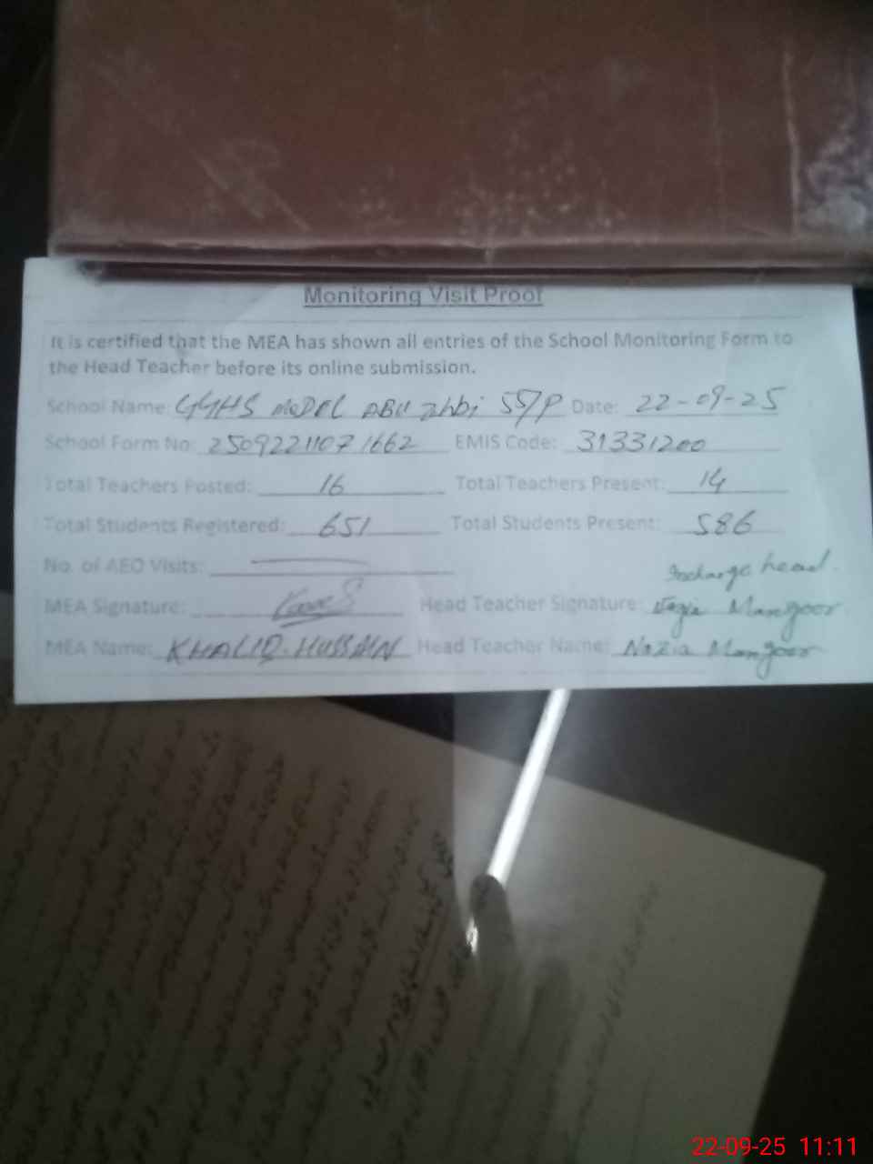 | Attendance Register | Head Teacher | MEA with School | Visit Proof |