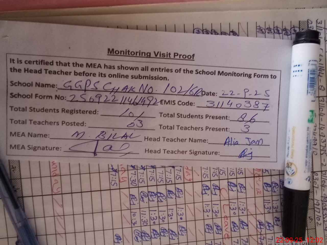 | Attendance Register | Head Teacher | MEA with School | Visit Proof |